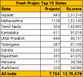 The second-ranked Maharashtra with the highest number of 1,129 new projects garnered fresh investment of Rs 1,51,130.28 crore. The state was followed by Tamil Nadu (304 projects worth Rs 1,43,901.84 crore), Karnataka (611 projects worth Rs 91,015.98 crore), and Uttar Pradesh (444 projects worth Rs 86,151.44 crore).
