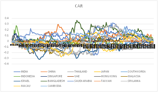 In the above we can see that the CAAR was in negative trend till the event day and just before the event day it started to stabilize, even after the event day the CAAR was stable for a while before falling down again. This shows that there were some other factors which affected the stock price like travel restrictions, government policies like lock downs etc.