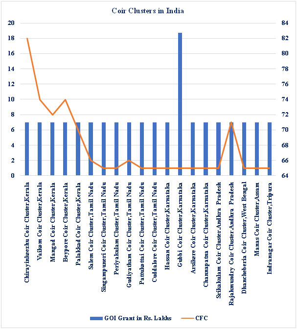 As per figure 8 the Government of India grant given is from Rs.71 lakhs to Rs. 82.72 lakhs to 20 coir clusters in India.