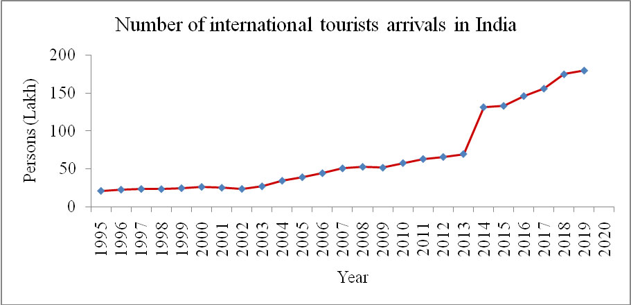 World Tourism organization, Yearbook of Tourism Statistics, Compendium of Tourism Statistics and data files. Accessed on 30.07.2021. https://data.worldbank.org/indicator/ST.INT.ARVL?locations=IN